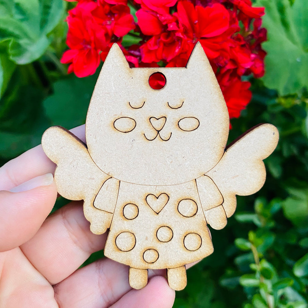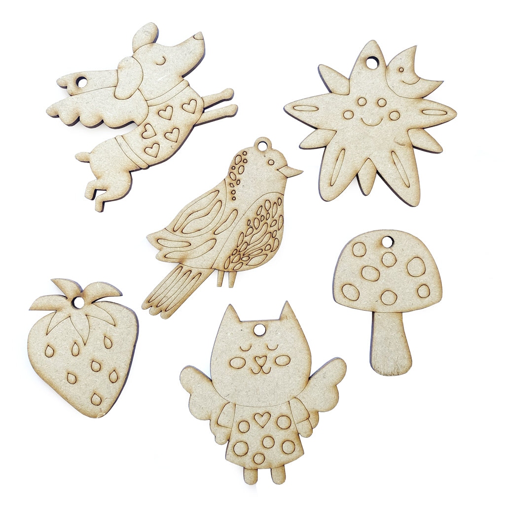 6 figuras diferentes para personalizar a tu pinta, este MDF de 3 mm. Puedes pintarlas con acrílicos o marcadores acrílicos, y es una actividad ideal para realizar en casa y luego colgar para decorar el arbolito de navidad.